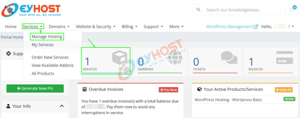 Once your payment is confirmed, log in to your EyHost Client Area. From your dashboard, go to Services > Manage Hosting to view and manage your active hosting package. You can also directly click on the “Services” tab to quickly access your hosting account. This section allows you to manage your WordPress site, access login credentials, and perform essential hosting tasks—all in one place.
